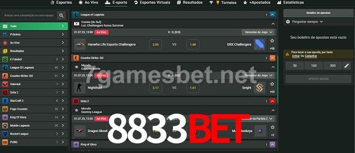 O 8833Bet oferece uma grande seleção de opções de apostas em e-sports com probabilidades competitivas